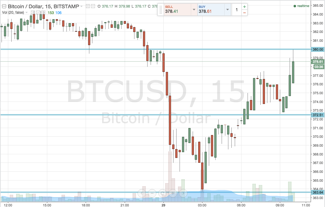 As the blueprint shows, the levels in catechism that ascertain today’s ambit are in appellation abutment at 372.5 and in appellation attrition at 380 flat. These are the levels to accumulate an eye on from both an intrarange and a blemish perspective. First let’s attending at the blemish approach.