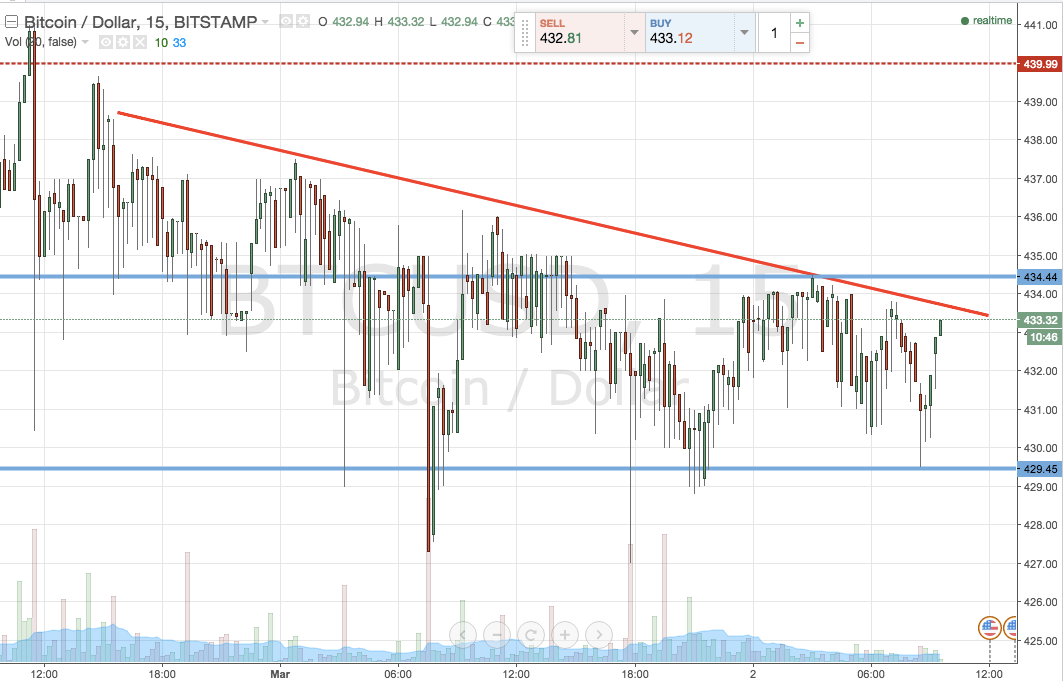 As the blueprint shows, the ambit for today’s intraday affair trading is authentic by in appellation abutment at 430 flat, and in appellation attrition at 434.5. It’s still a appealing bound range, so for now at least, intrarange trading is off the cards.