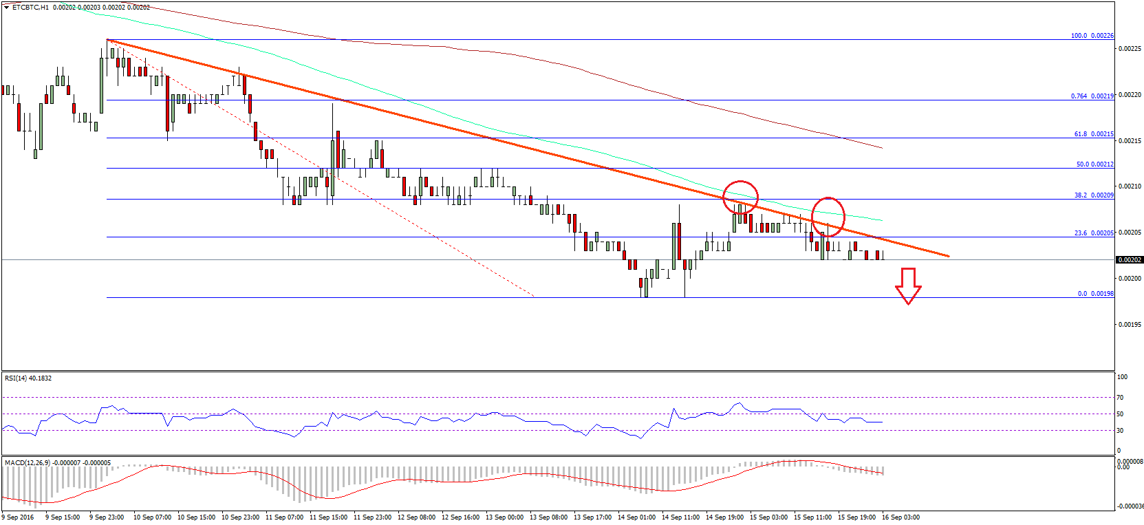 Ethereum archetypal amount managed to correct a few credibility bygone adjoin Bitcoin afterwards crumbling beneath 0.0020BTC. However, the upside was limited, as the burst abutment of 0.00205BTC now acted as a resistance. It prevented the upside move and pushed the amount down. Moreover, the 23.6% Fib retracement akin of the aftermost leg from the 0.00226BTC aerial to 0.00198BTC low additionally acted as a barrier for buyers.