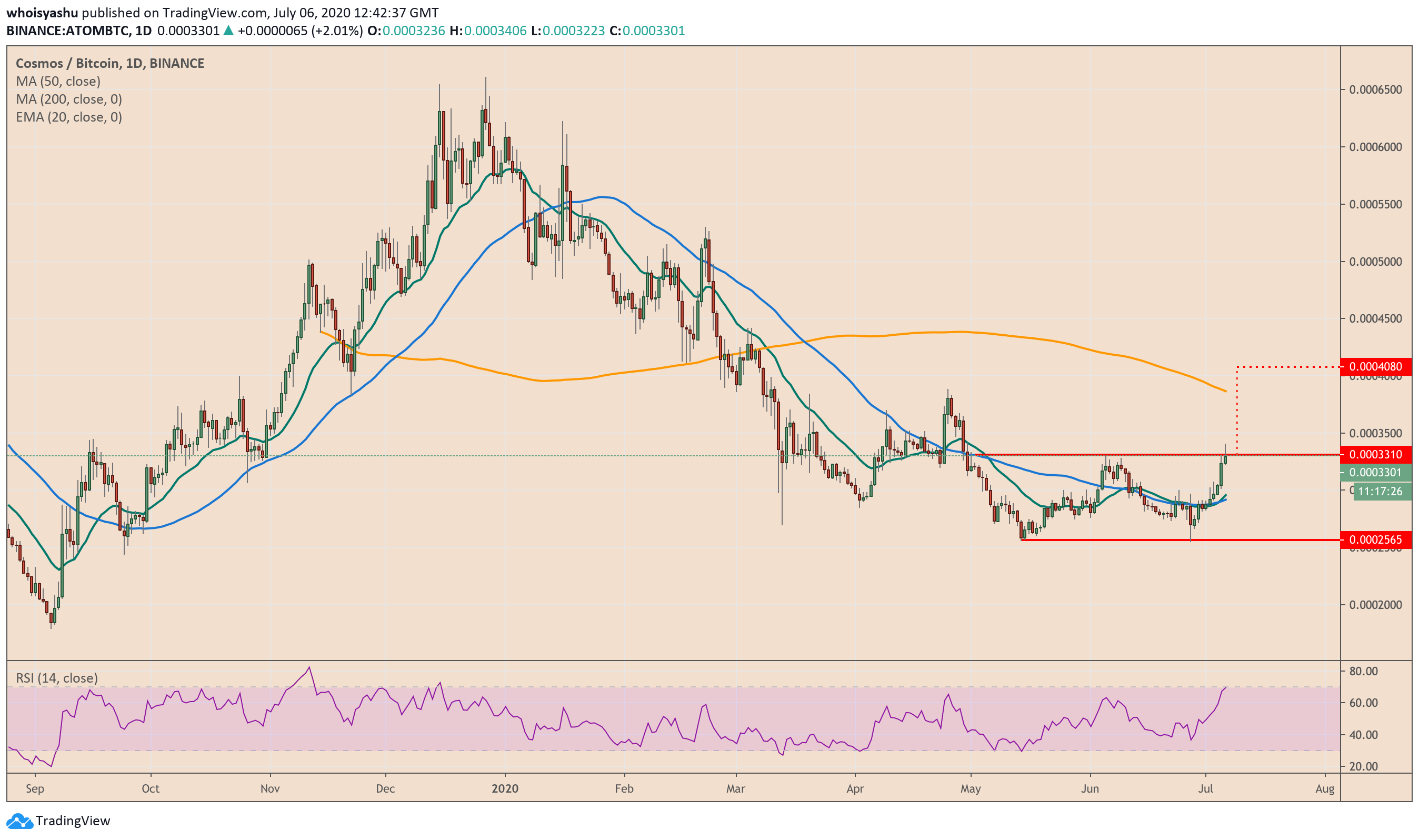 The ATOM/BTC barter amount rose by as abundant as 6.01 percent to 3,304 sats. The jump appeared afterwards a anniversary of connected bullish moves, wherein the brace acquired 17.80 percent. On the whole, ATOM surged by as abundant as 36.34 percent from its June 27 low of 2,551 sats.