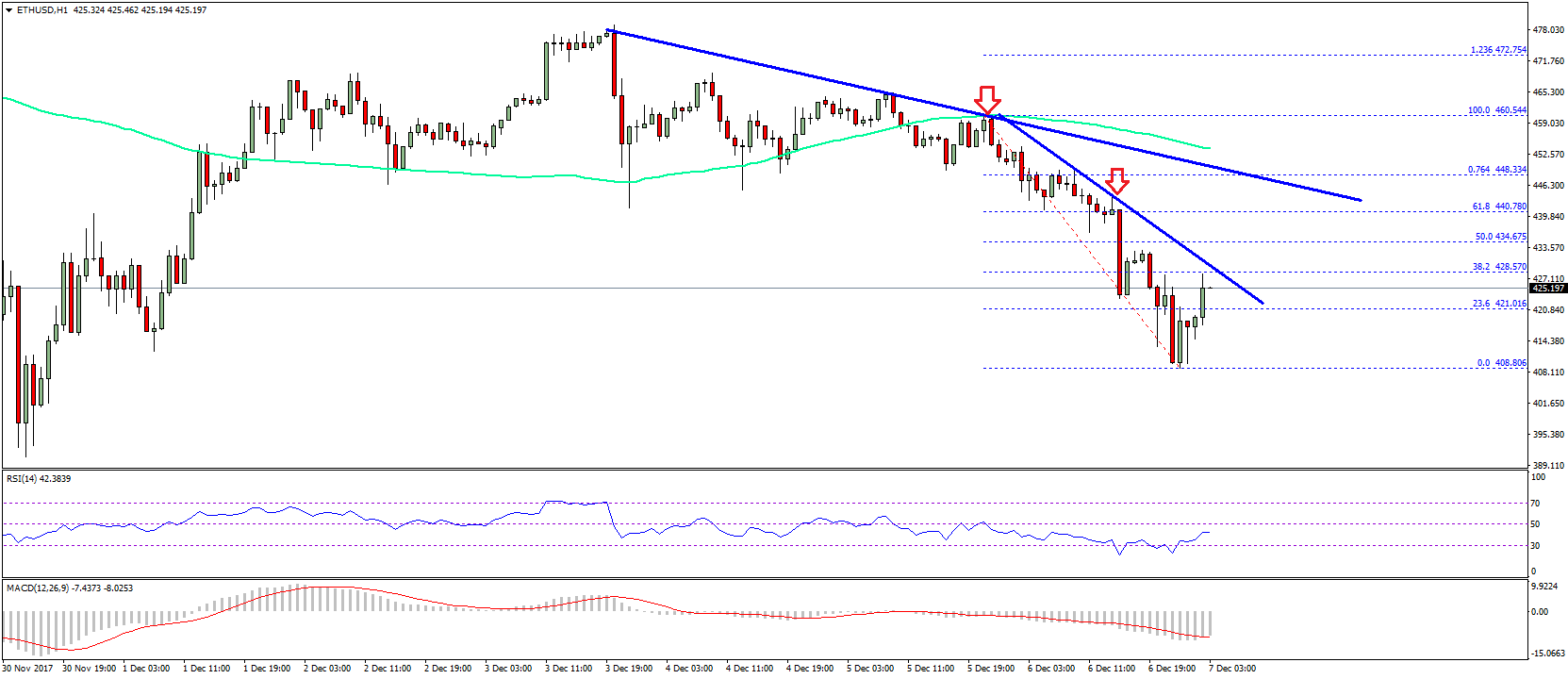 There was no aloft recovery in ETH amount aloft the $460 akin adjoin the US Dollar. The amount came beneath renewed affairs burden and traded beneath the $430 and $425 abutment levels. It about activated the $400 handle and traded as low as $408.80. At the moment, the amount is acclimation college appear $430. It has confused aloft the 23.6% Fib retracement akin of the aftermost abatement from the $460.54 aerial to $408.80.