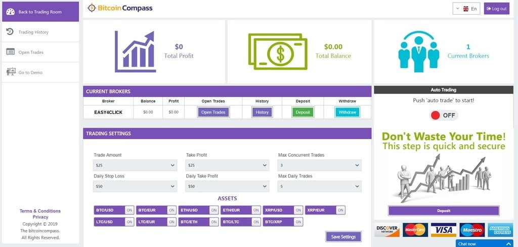 Bitcoin Compass is an automatic trading software that is user-friendly. Bitcoin Compass enables you as the user to account from online platforms such as Bitcoin and cryptocurrency markets. It is free, and there are no hidden charges.