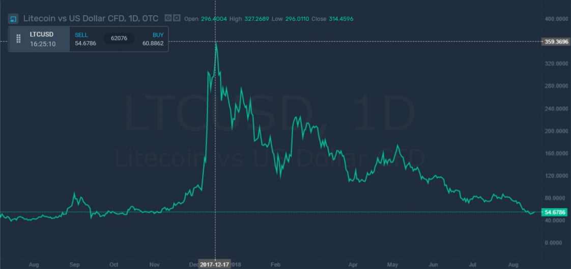 Litecoin has been accident amount continuously back December. Source: SimpleFX.com