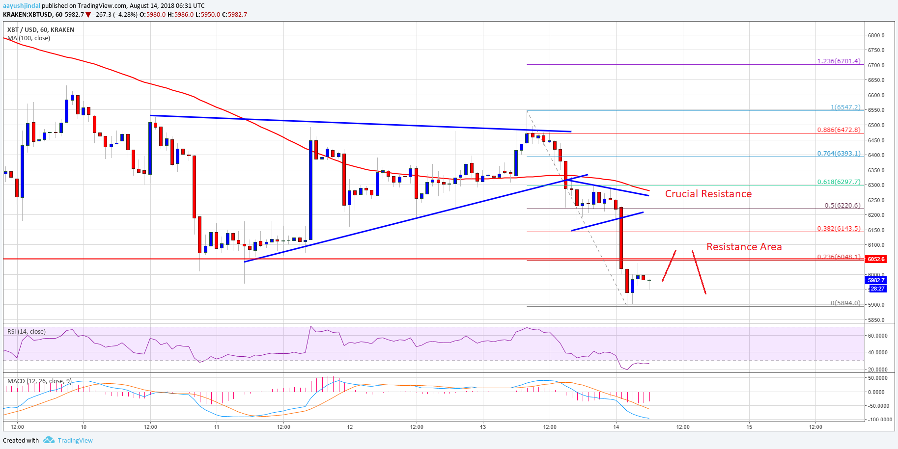 Yesterday, we discussed that bitcoin amount could accretion momentum if it breach the $6,570 attrition adjoin the US Dollar. The BTC/USD brace bootless to breach the $6,570 and $6,600 attrition levels, and declined. It alone acutely and bankrupt abounding supports like $6,450, $6,300 and $6,280. It alike acclimatized beneath the $6,100 akin and the 100 alternate simple affective average.