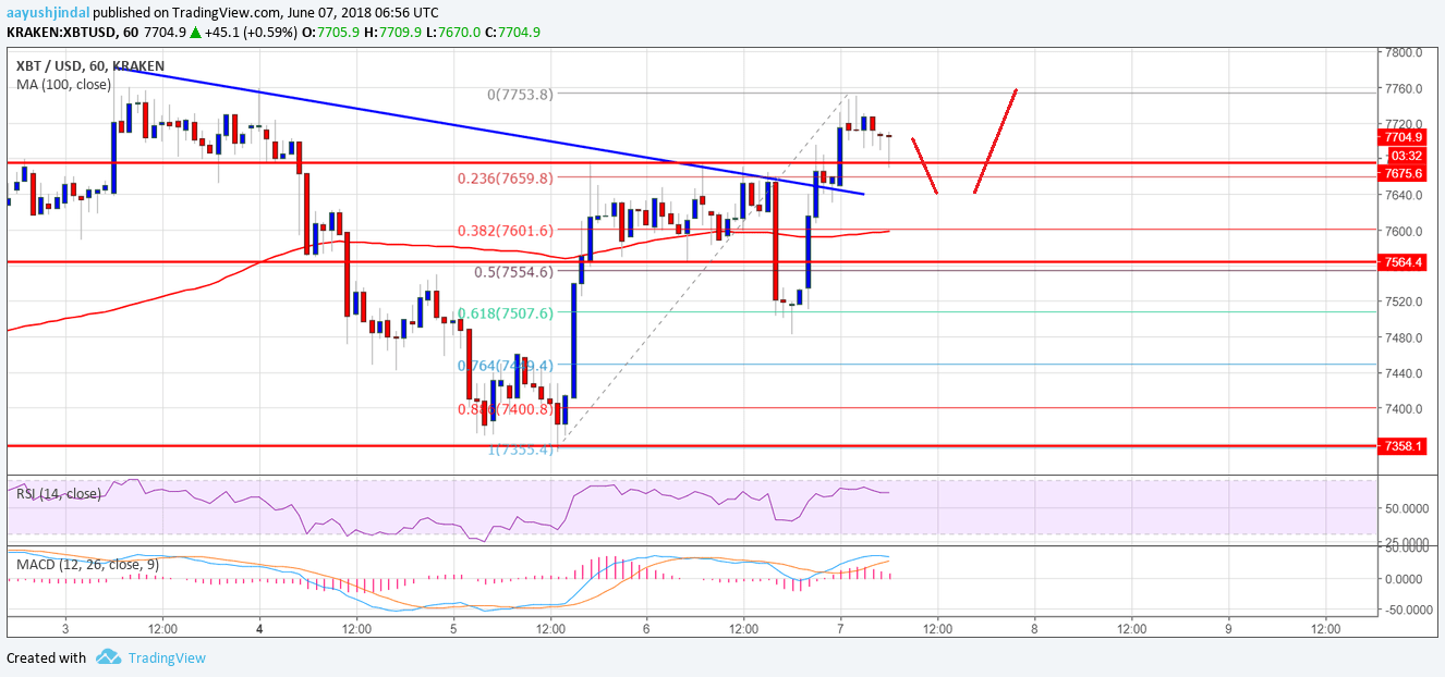The accomplished three sessions were positive as bitcoin amount managed to accretion absorption added aloft $7,500 adjoin the US Dollar. The BTC/USD brace traded boring college and bankrupt a few important hurdles abreast $7,600 and $7,650. There was a able abutting aloft the $7,600 akin and the 100 alternate simple affective average. A aerial was formed at $7,753 and the amount is currently acclimation gains.