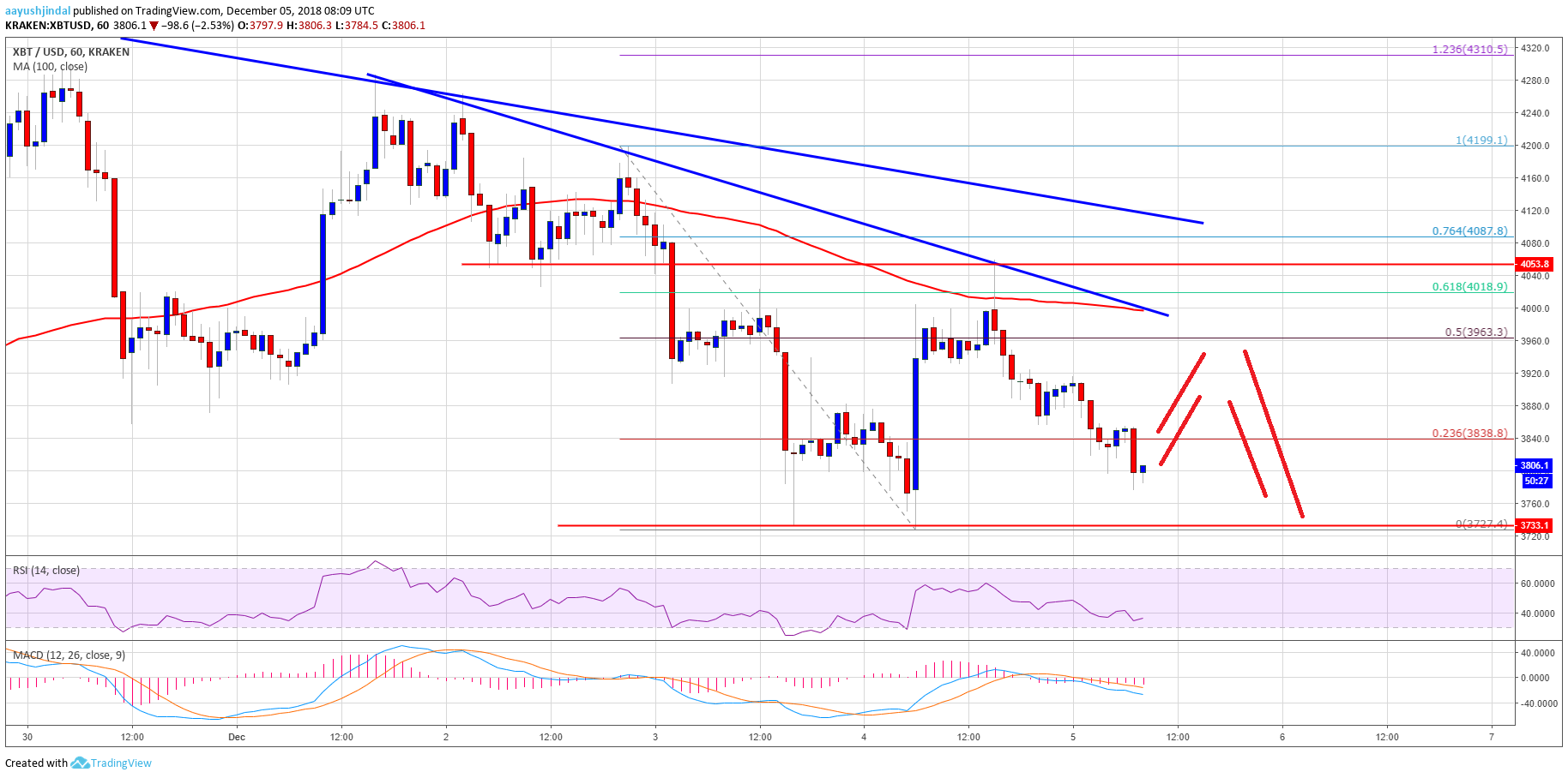 Looking at the chart, bitcoin amount is acutely trading in a aloft declivity beneath $4,020 and $4,080. As continued as there is no abutting aloft $4,150, there could be constant declines in BTC.
