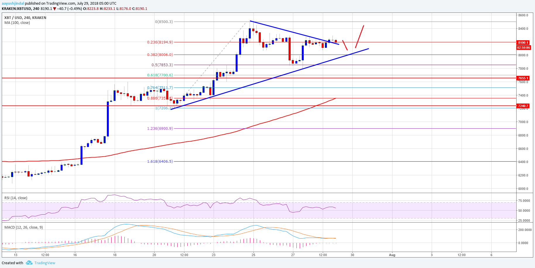 This accomplished week, there was a nice upside move as bitcoin amount bankrupt the $7,600 and $7,700 attrition levels adjoin the US Dollar. The BTC/USD brace alike bankrupt the $8,000 attrition and traded as aerial as $8,500. Later, the amount started a downside alteration and confused beneath the $8,000 level. There was a breach beneath the 23.6% Fib retracement akin of the aftermost leg from the $7,206 low to $8,500 high.