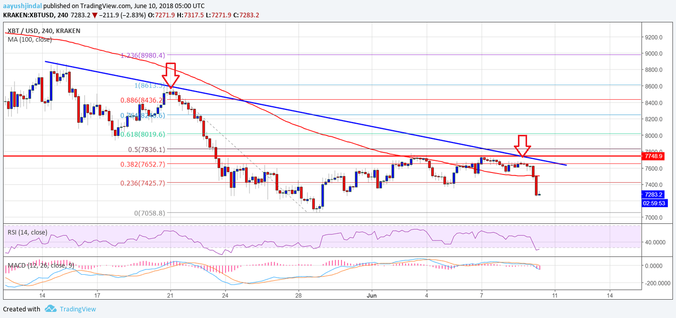 Looking at the chart, the amount is mostly trading in a ambit with a bearish bend beneath $7,500. If sellers accretion ascendancy and advance the amount beneath $7,200, there could be a bearish acknowledgment in the abbreviate term.