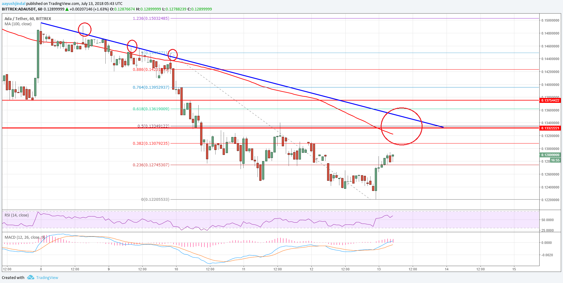 After a breach beneath the $0.1340 support, cardano amount declined further adjoin the US Dollar. The ADA/USD brace bankrupt the $0.1250 abutment and traded abutting to the $0.1220 level. A low was formed at $0.1220 afore the amount started an upside correction. It acquired drive and confused aloft the 23.6% Fib retracement akin of the aftermost bead from the $0.1449 aerial to $0.1220 low.
