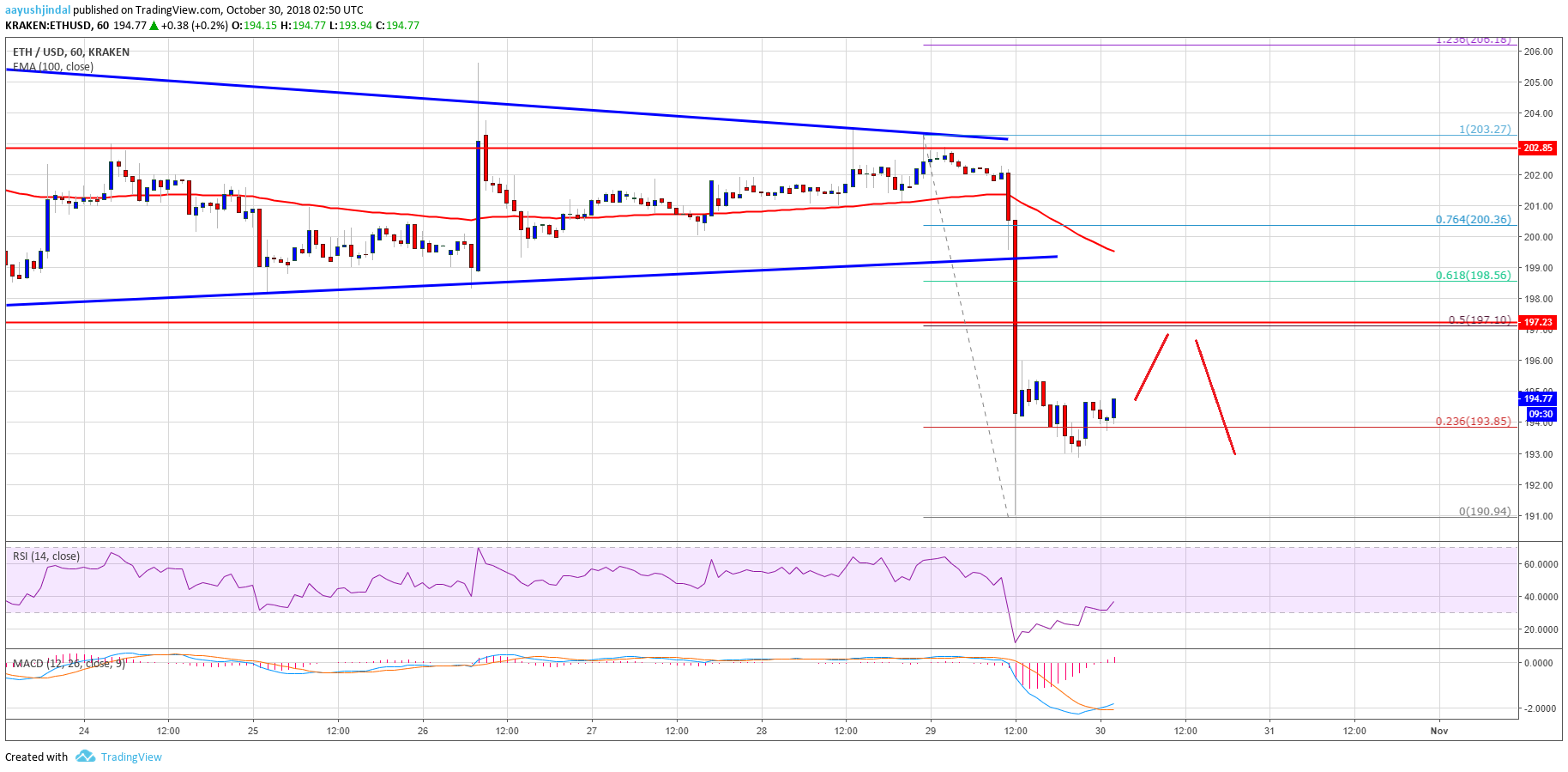 After trading in a ambit for a few days, ETH amount started a downside move adjoin the US Dollar. The ETH/USD brace beneath acutely afterwards it bootless to move accomplished the $203 and $204 attrition levels. The amount bankrupt the $201, $200 and $197 abutment levels to move into a bearish zone. There was alike a abutting beneath the $197 abutment and the 100 alternate simple affective average.