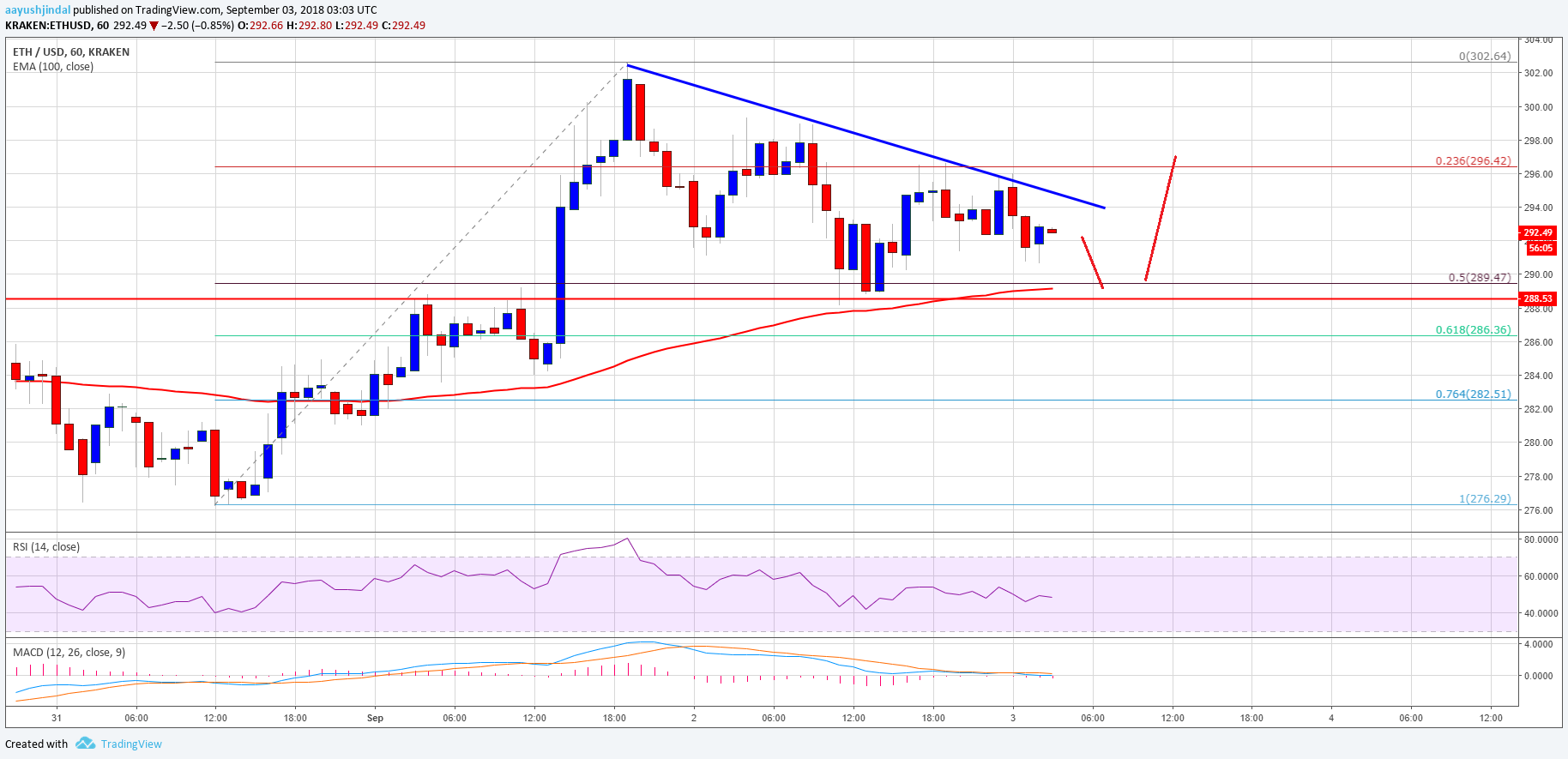 However, losses were adequate abreast the $285-288 abutment zone. The declared akin was a attrition beforehand abreast $288 and now preventing declines. The 50% Fib retracement akin of the aftermost leg from the $276 low to $302 aerial is additionally at $289. Moreover, the 100 alternate simple affective boilerplate is positioned abreast the $288 level, signaling its importance. Therefore, as continued as the amount is aloft the $285-288 support, it could move higher. On the upside, there is a aloft bearish trend band formed with attrition abreast $295 on the alternate blueprint of ETH/USD. A breach aloft the trend band and $298 may able-bodied bright the aisle for added assets appear the $310 level.