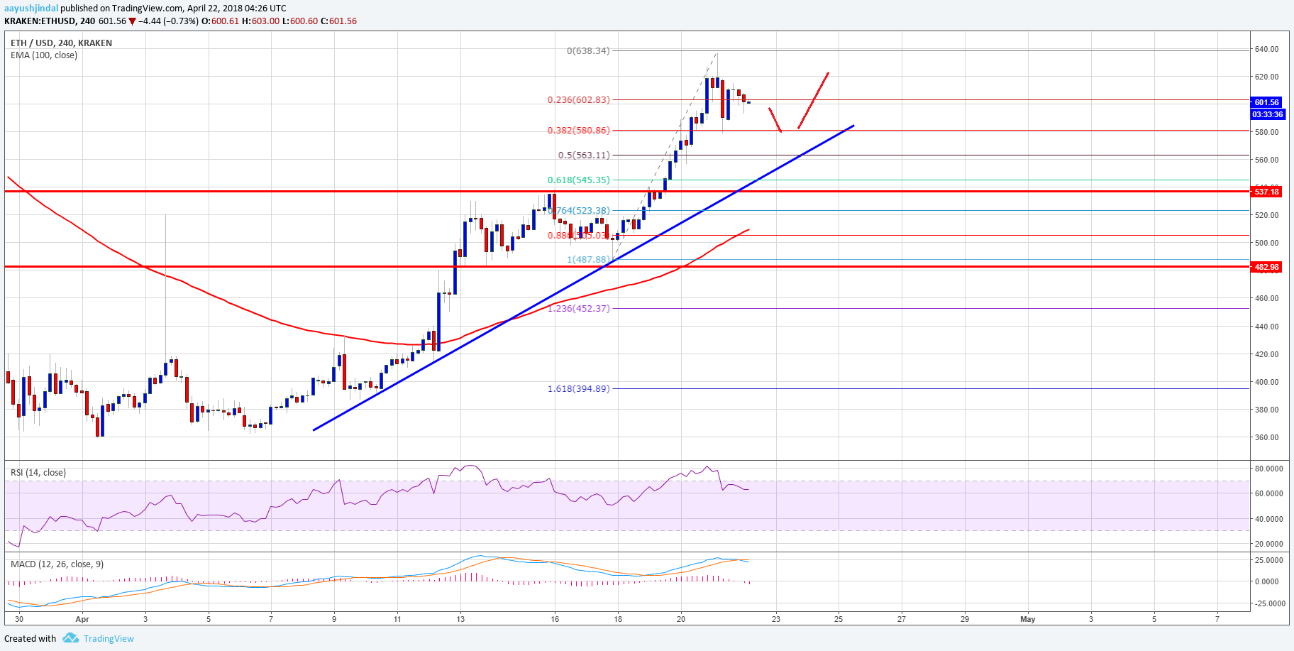 This accomplished week, there was a solid upside move from able-bodied beneath $500 in ETH amount adjoin the US Dollar. The amount surged college and it was able to breach abounding resistances such as $550, $580 and $600. It traded as aerial as $638 afore it faced affairs interest. A concise downside alteration is underway and the amount has confused beneath the 23.6% Fib retracement akin of the aftermost beachcomber from the $487 low to $838 high.
