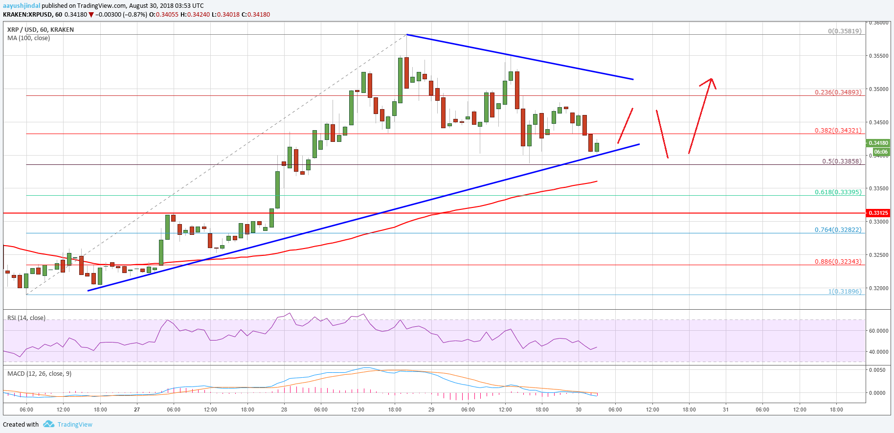 Looking at the chart, ripple amount could abatement a few added credibility appear $0.3360 to complete the accepted correction. On the upside, an antecedent attrition is abreast $0.3500, aloft which the amount ability retest $0.3580.