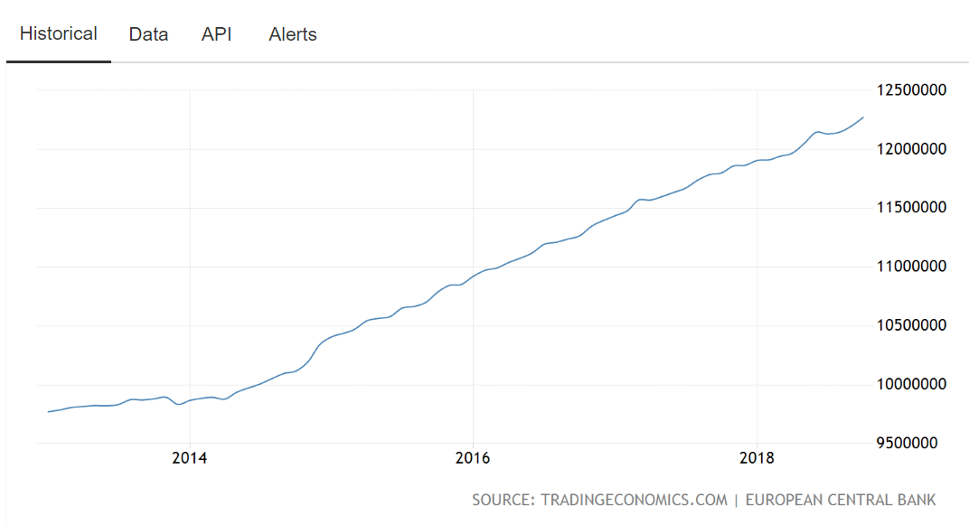 Here we can see the akin of M3 money in the Eurozone activity from beneath than €10 quadrillion to added than €12.27 quadrillion in aloof four years.